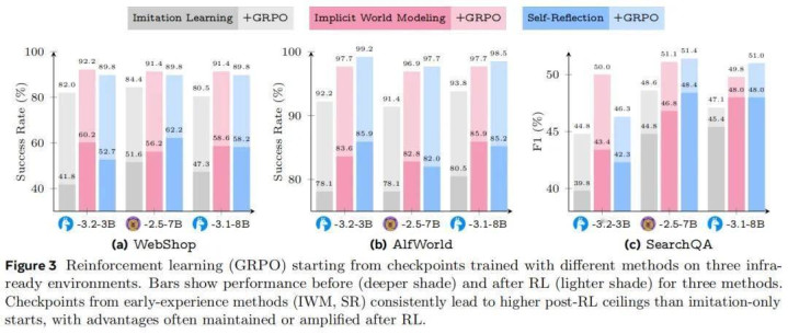 可见,在几乎所有场景和两种模型规模下,早期经验的提升效果都优于模仿学习。隐式世界建模(IWM)在结构化模拟器和交易类网站中表现稳定,自我反思(SR)则在需要多步骤推理和约束满足的任务中进步最大。