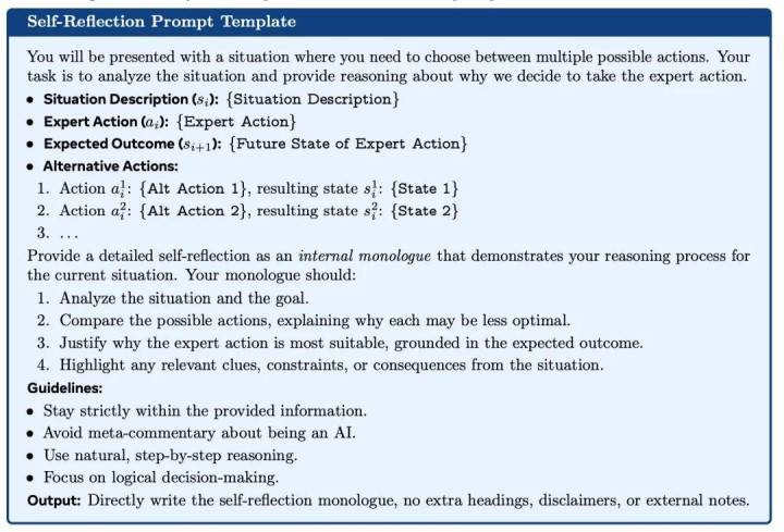 作者将「自我反思」形式化为一种机制,使智能体能够从自身的探索结果中学习。与仅依赖专家的状态 — 动作对不同,智能体在每个状态下会将专家动作与从自身策略中采样得到的替代动作进行比较,并根据它们产生的后续状态,用自然语言生成解释,说明为何专家的选择更优。这些解释比单纯的专家动作提供了更丰富、可迁移的监督信号,借助大语言模型在语言处理方面的优势,使智能体能够内化可在不同任务间泛化的决策原则。